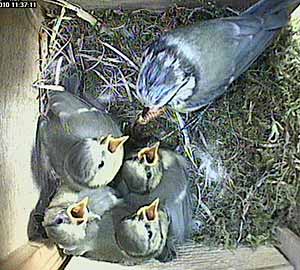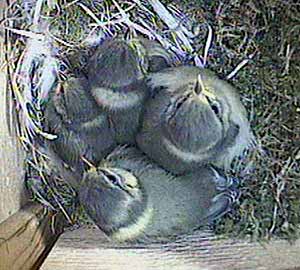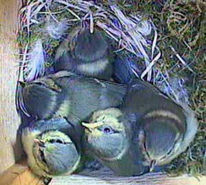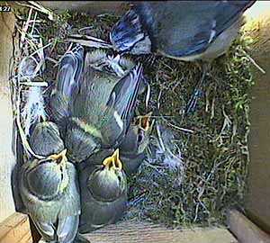 Shortly after 11 o'clock, I had a (self created!) computer problem and we were off the air for about half an hour while I sorted things out. Just before we went off the air, all five chicks were present as you can clearly see from this picture. (Will is on duty this time - as usual!)
