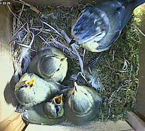 At the end of the day, there are still four chicks in the nest box. At this stage we still hadn't noticed that one chick had fledged.