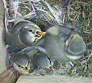 Looking at the first pictures taken half an hour later, once I had sorted things out, you can see that apparently there are only four chicks in the box, although we didn't notice this until much later.