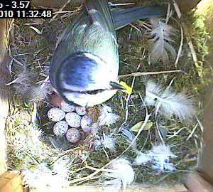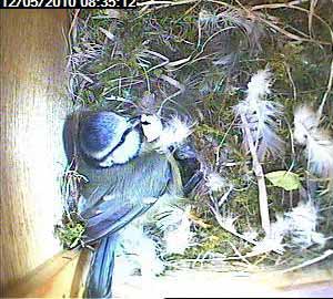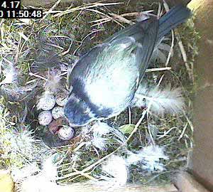 At last something seems to be happening! It is 8:35am and here is a picture of Rosie with a piece of eggshell in her beak.