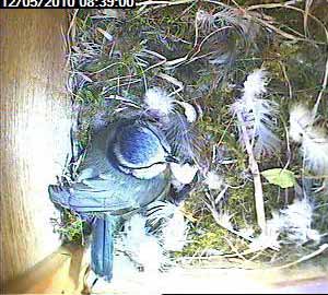 It is 15 minutes before we catch a glimpse of the chick. Rosie has left the nest box, whether to collect food or to tell Will I don't know.
