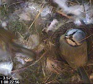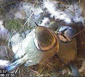 Of the two females, one appears to have blue head feathers that are more streaked than the other whose head feathers are a more uniform blue colour. But which is this? Whichever it is appears to be incubating.