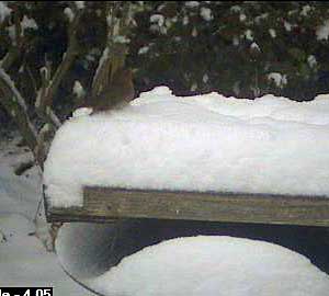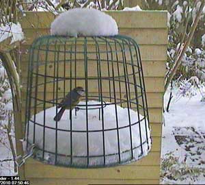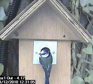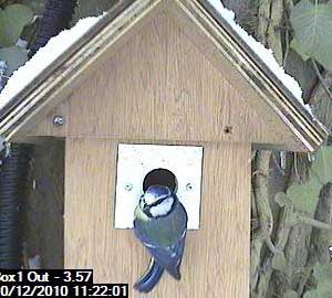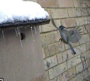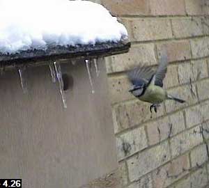 The thaw has started and Box3 now has a curtain of icicles hanging from the front edge of its roof. However, a bluetit manages to navigate its way to the entrance hole without crashing into them!