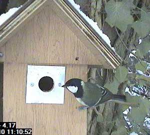 Directly the weather improves, the birds suddenly become more interested in the nest boxes again. Here a great tit is looking at Box1.