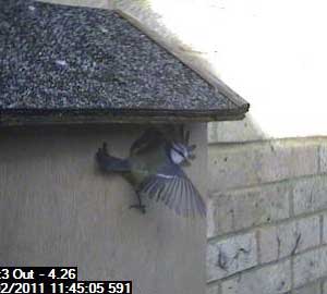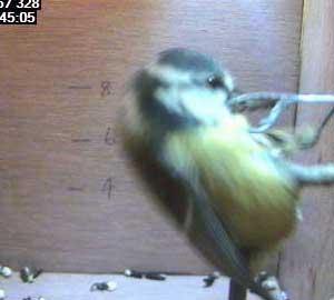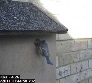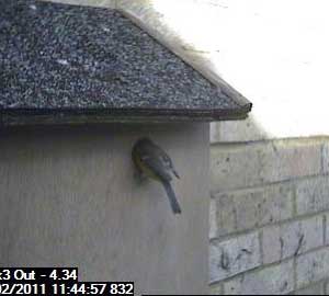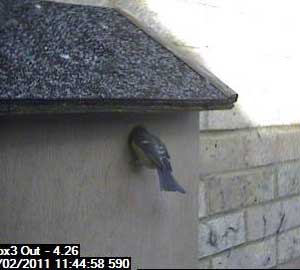 How do I know these are Harry and Will? Well, Harry is a slighter bird with a thinner tail and a thinner neck and shoulders (which are not visible here). Also, he usually goes into the box in one easy movement - he does not hesitate at the entrance hole.