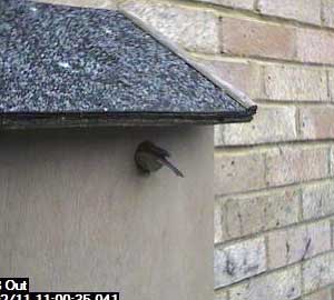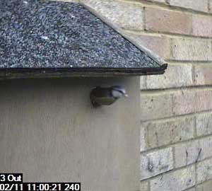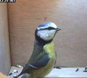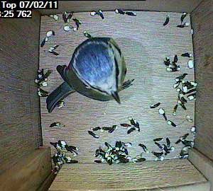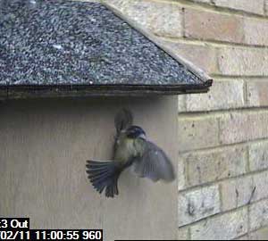 This is Zoe, the female bluetit who has spent much of the day cleaning up the box. She has been in and out from the start of recording and was only interrupted by events outside her control, namely the fight between Harry and Will.