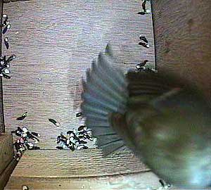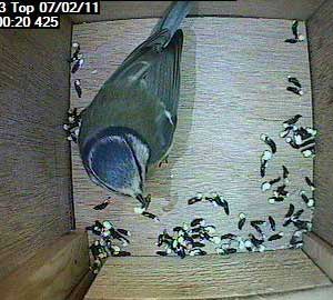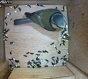A couple of hours later she gets down to it in earnest, starting to remove 2 or 3 pellets a minute in a regular cycle of flights in and out of the box.