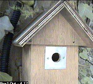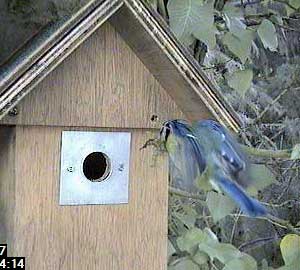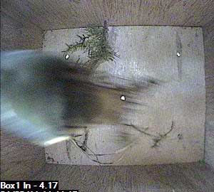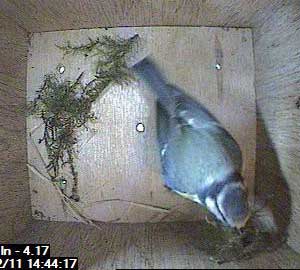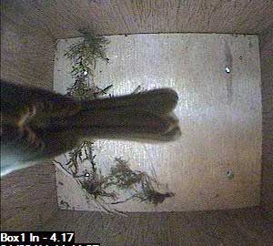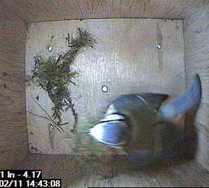 Over half an hour later, Amy is back with another load. You can just see her approaching the box with moss in her beak in the top left of the picture.