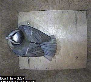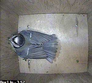 But the bluetit inside the box couldn't stand it any longer and left, knocking the other bird off its perch.