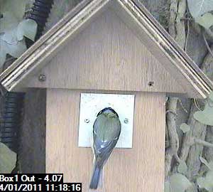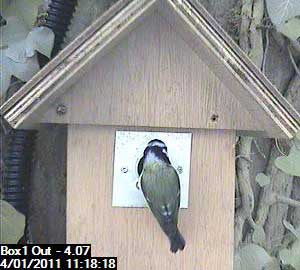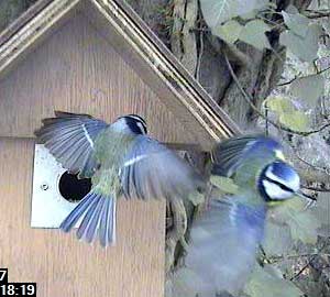 Now, judging by these two bluetits' head feathers, I would have said the one that had been in the box was a female and the bird on the hole a male. It's definitely got a bit of a ruff, whereas the bird leaving the nest box looks smooth and polished.