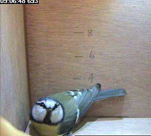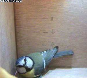 This looks like a male bluetit inside the box.