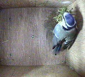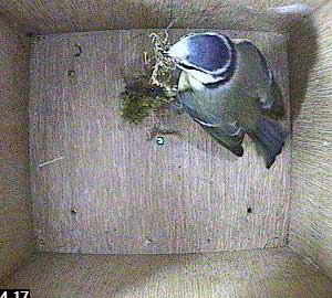 Finally, an hour and a half later, a male bluetit - presumably her partner - came to inspect progress. I hope he was happy with what he saw.