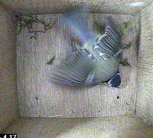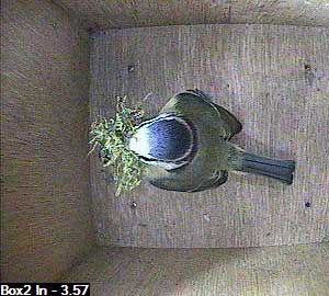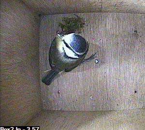The weather has been bright and sunny for the last few days. Today, though dry, is not quite as good but the female in residence in Box2 must have caught the nest building bug as at around half past twelve, she came in with some nesting material.