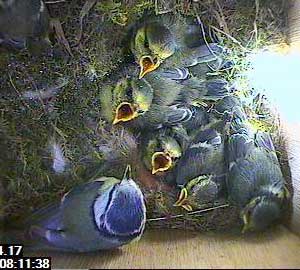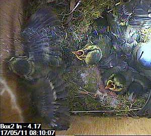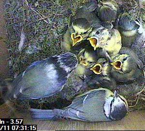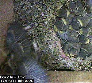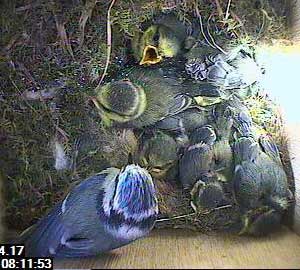 Here are both parents in the nest box. Joy has just finished feeding a chick and Dave is in the middle of doing so.