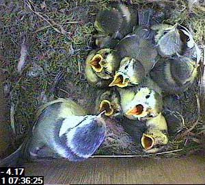 Our bluetit chicks do not appear to be suffering from lack of food as reported by several members of our forum. To try to quantify this, I have counted the number of times each parent brings food to the nest box during a half hour period.