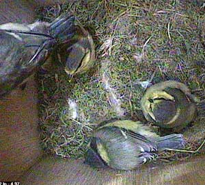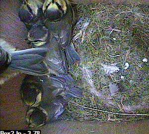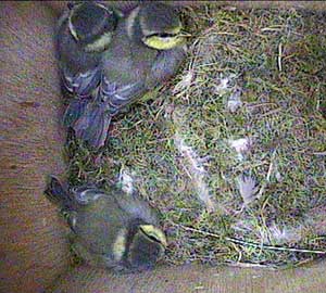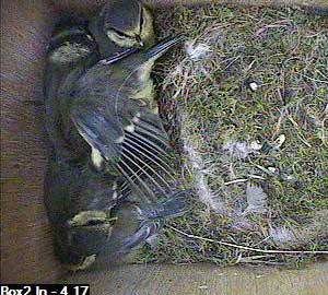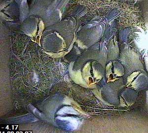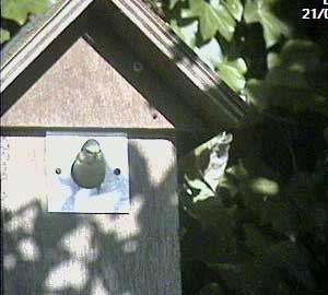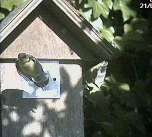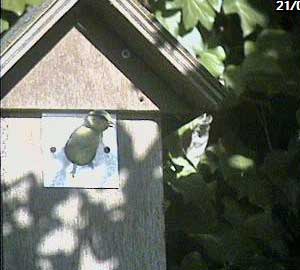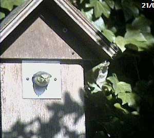 It was just my luck that at just this time my computer suffered a temporary glitch and I had to reboot. By the time I had got things going again, the seventh chick had flown. Although you may not be able to see it, there are still three chicks in the box ...