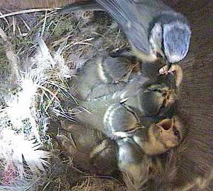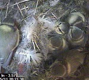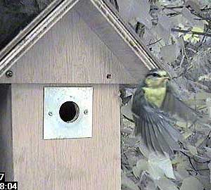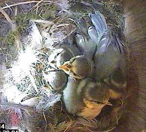 At this stage (it is just after 8am), all seven chicks are still in the box. Here Amy is bringing in a mealworm. Considering that she is managing to support these chicks entirely on her own, and has been doing so since 17th May, she is doing a fantastic job.