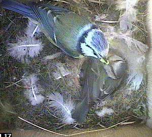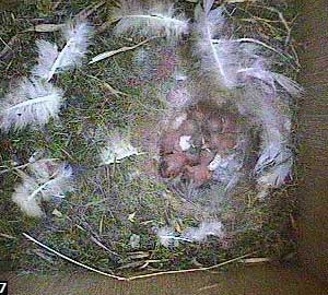 In Box2, Dave is being a good parent and frequently brings in food for the chicks. Here he is with a small green caterpillar - the staple food of the chicks in this area where there are plenty of oak trees.