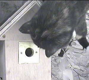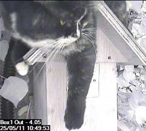 It actually manages to get a paw inside the box in the hope of catching something I suppose. Fortunately the chicks have the sense to cower down in the nest cup.