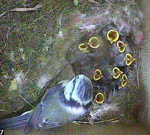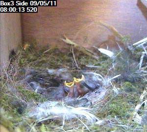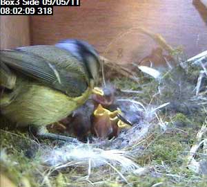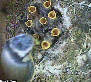 brings in a little green caterpillar to Box3 and 8 gapes rise in unison - presumably the ninth chick was the lucky recipient of the last one and is too full to clamour for more at the moment.