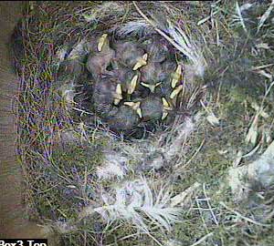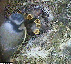 It looks as though Joy and Dave in Box2 also have at least nine chicks. Dave has just come to the box and they are all clamouring for food. Again, 9 out of 10 eggs is pretty good.