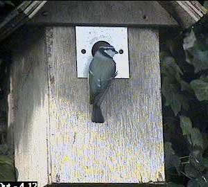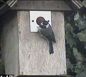 Now it's a great tit's turn to have a look - and that reminds me, I haven't replaced the plate over the entrance hole that reduces the size to 28mm. This allows bluetits to get in easily but the local great tits appear to find it too small for comfort.