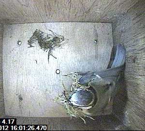 The bluetits haven't been slacking though. This bird brought some bedding into Box1 for the first time yesterday. She's only playing at it so far though. She will probably be taking it out again next!