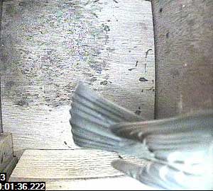 He immediately flies up to the exit to look for his opponent. Apparently, he could not see him because he than spent a little time looking inside the box to #make sure he wasn't hiding somewhere inside. He finally flew off a minute or so later.