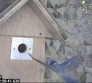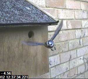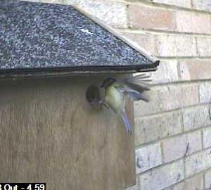 This is a bluetit approaching the entrance to Box3. On this occasion, it didn't enter the box.