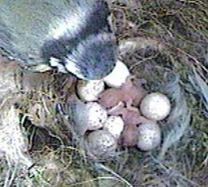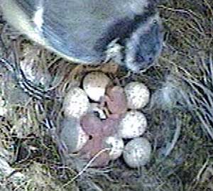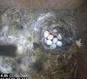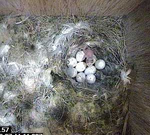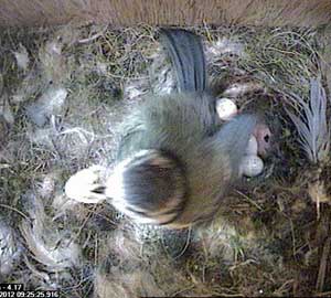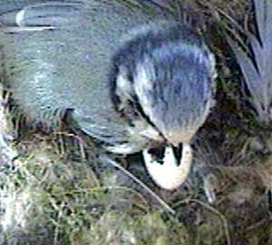 Interestingly, after a considerable period of indecision (about a minute), Becky flies out of the nest with it. She doesn't eat the shell like Jess did for most of hers.
