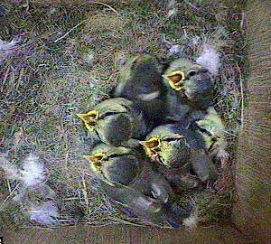 If the woodpecker discovered them now he would find it easy to catch a chick or two. All they would do would be to huddle close to the floor. That's fine when they are in the nest cup, but judging from our previous experience, they seem to have no idea of getting away from the nest box hole.