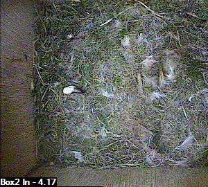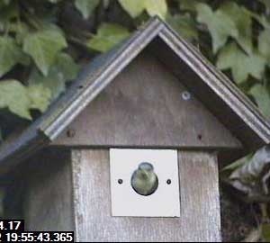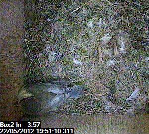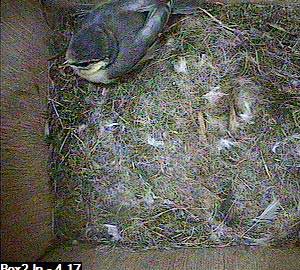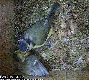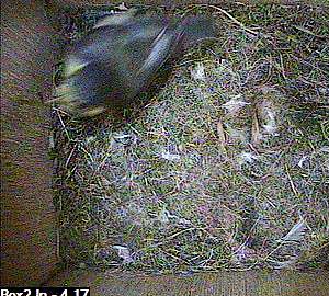 Ten minutes later Mum is back to see if there are any more chicks to look after in the nest box. Of course she just has to clean out the last dropping before she goes!