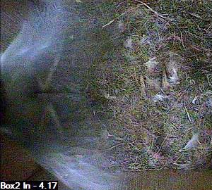 Mum comes in but seems more interested in keeping her box clean than comforting her chick.