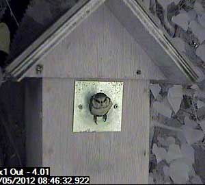 At long last, at about half past eight, a chick jumped and flapped up to the exit hole ...