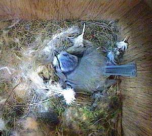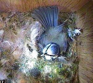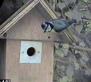 All it is is a male bluetit! Clearly it is not Bob who would be welcomed as the bringer of food. Perhaps he is one of the pair that keeps looking at Box3 but never does anything remotely like starting to build a nest there!