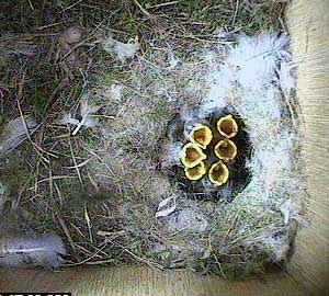 Jess still has 6 live chicks and they all appear eager for food. As she laid 9 eggs, this means that as well as the one accidentally thrown from the nest cup, there must be two others that have died and presumably been removed in the early hours of the morning.