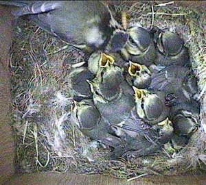 There are definitely 12 chicks here. They are starting to wander out of the nest cup and all over the bottom of the nest box. They will be fledging in a few days.