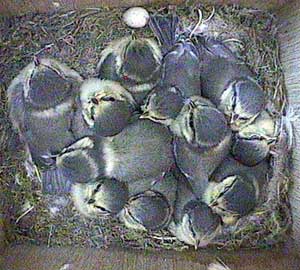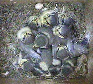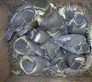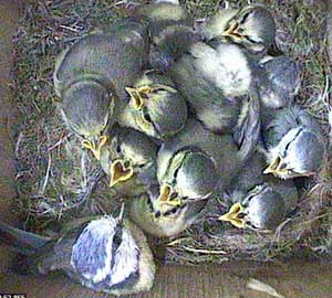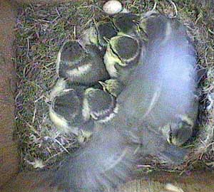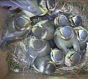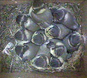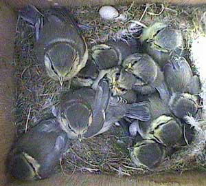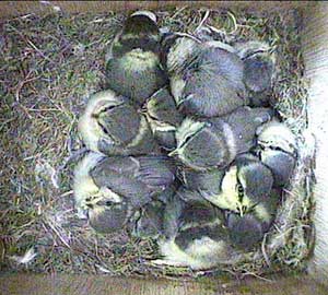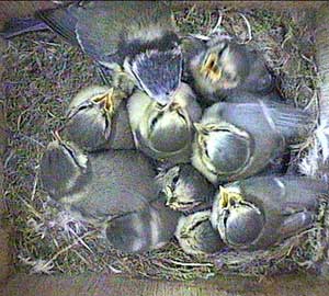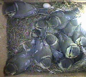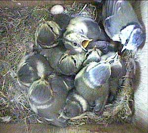 An early morning (well for us anyway!) shot showing the way the chicks are now wandering all over the floor of the nest box. They will be fledging soon!