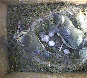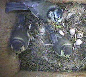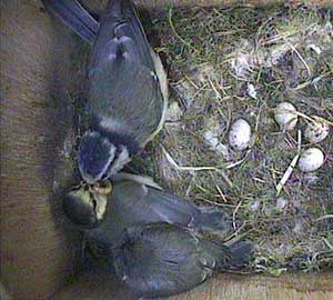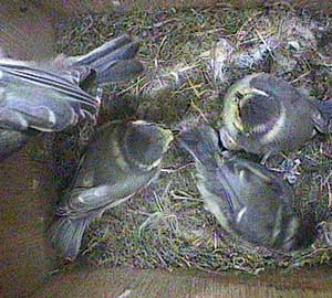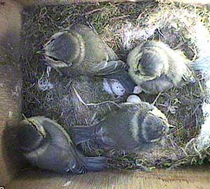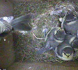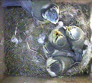 In spite of now having most of the chicks outside the box, the parents still seem to be able to find time to look after the chicks that remain in the box.