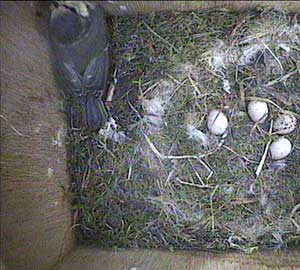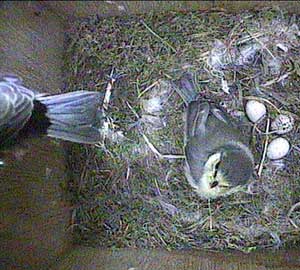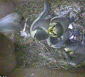 Shortly after, she is joined by Sally (or is it Sam?) These two chicks are being well and truly spoilt. There are ten chicks outside, all I'm sure clamouring for attention, and yet two of the three parents seem to be able to spend the time necessary to get the last two chicks to leave the box.
