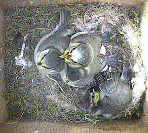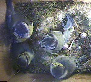 Now there is just one chick left in the box. It has never been by itself before! It huddles in the corner for comfort. (We have seen this behaviour most years before the final chick fledges).