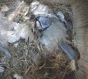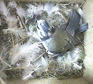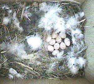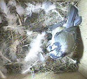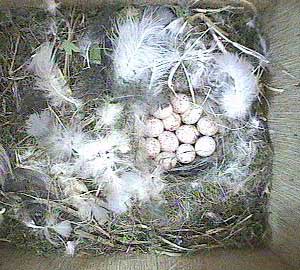 Here's Scruff bringing nesting material into the nest box while Sally is sitting on the eggs.