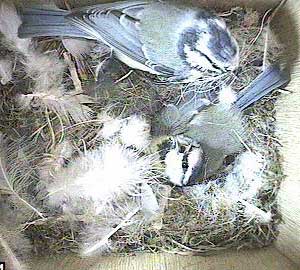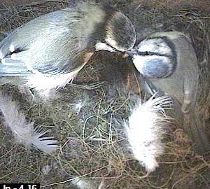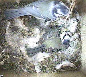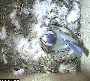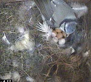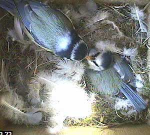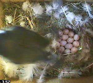 This is the problem with Box2. Yesterday there were 8 eggs in the nest box and today there are clearly at least 10. As a bluetit can only lay 1 egg each day, then either yesterday's figure of 8 was wrong, in which case every egg total from the beginning was wrong, or two females must be laying an egg each in this box.