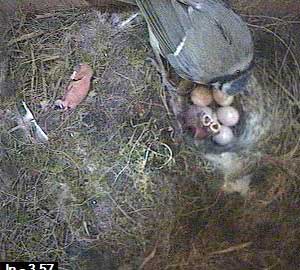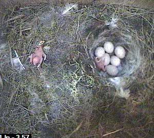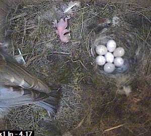 Suddenly, shortly after 10 o'clock, Kelly can be seen eating a piece of egg shell. Another egg must have hatched.
