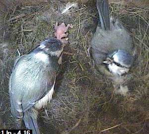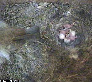It's odd that the parents don't seem to notice a chick out of the nest cup. We've noticed this in previous years when a chick has escaped from its confines.