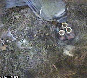 How do we know this is Kit? Well each parent has a favourite side of the nest box it arrives in when coming with food. Kit's favourite side is at the top of the picture. Also, Kelly normally hops onto the nest cup after feeding the chicks to warm them up a bit. This bird doesn't do this so it is probably Kit.
