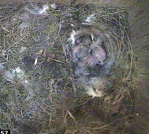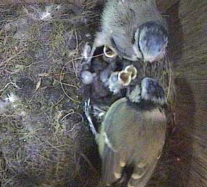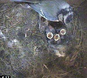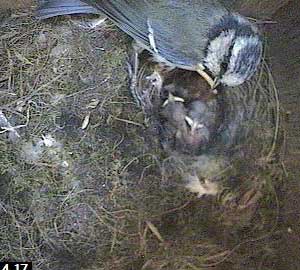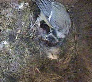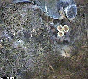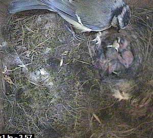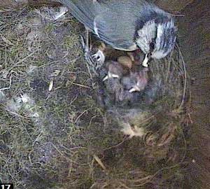 And it's bad news in Box1. All the remaining three chicks have died. We think that Kelly, the female bluetit, was predated some time during the afternoon today and with no mother to keep them warm overnight, the chicks just died of cold.