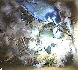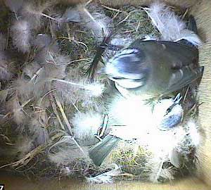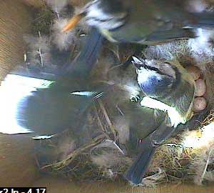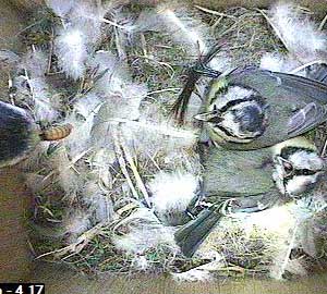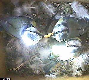 Scruff comes in with a beak full of material for finishing of the nest. Sally seems to think it is some food for her!