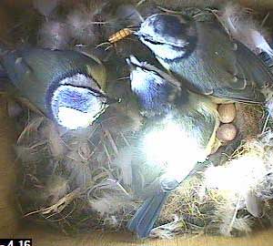 Directly after this, Sam comes into the nest box with some real food (a mealworm!). Both females beg for it!