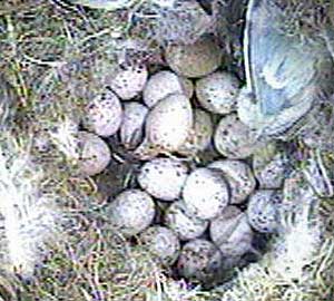 There was a short period around 10:46 today when Sam had come to the nest with a mealworm and Scruff was on the eggs by herself. In order to get the food, she got off the nest and moved around over the eggs to take it. As she moved, some eggs were uncovered and some were covered. This image is a composite image made from these shots in order to show all 21 eggs!